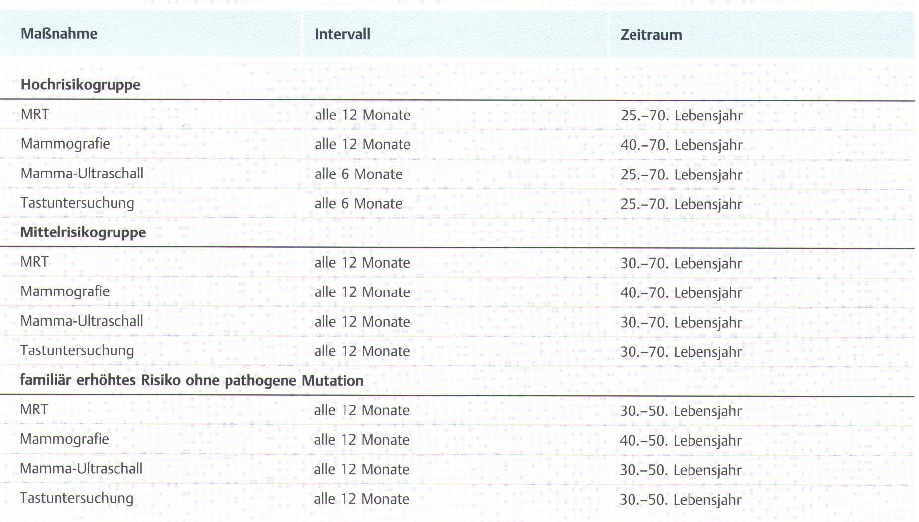 intensivierte Früherkennungsprogramm umfasst den Ultraschall der Brust alle 6-12 Monate (in Abhängigkeit vom Nachweis einer Mutation in den Hochrisikogenen BRCA 1 oder BRCA 2), eine Mammographie und eine Kernspintomographie (MRT) einmal im Jahr.