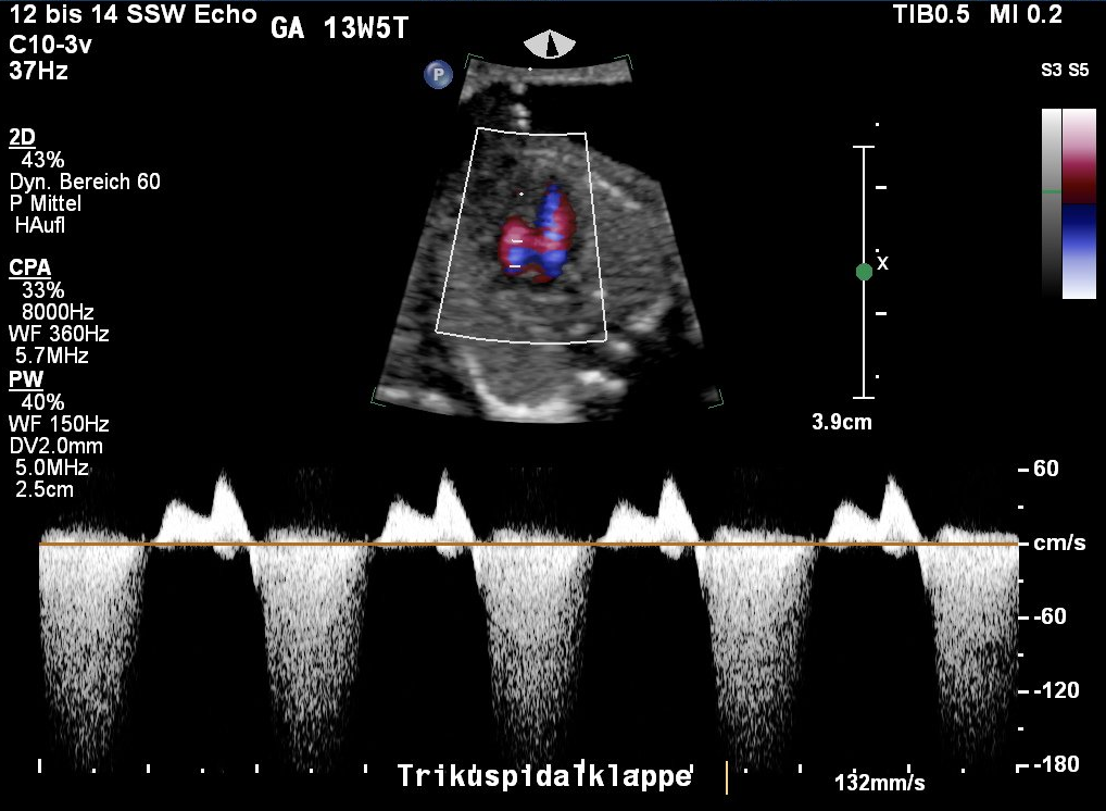 genannt, wird nach einer Trikuspidalklappenregurgitation (TK) gesucht, einem unzureichenden Klappenverschluss. Physiologischerweise zeigt sich über dieser Herzklappe kein Rückfluss in der Systole, der Blut-Ausströmungsphase des Herzens. Ein Regurgitation liegt definitionsgemäß vor, wenn der Rückfluss mit einer Spitzengeschwindigkeit von mindestens 60 cm/s die Hälfte der Systole betrifft. Dieser liegt bei Feten ohne Chromosomenstörung in 1 % der Fälle
